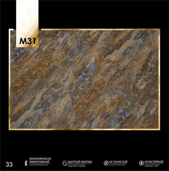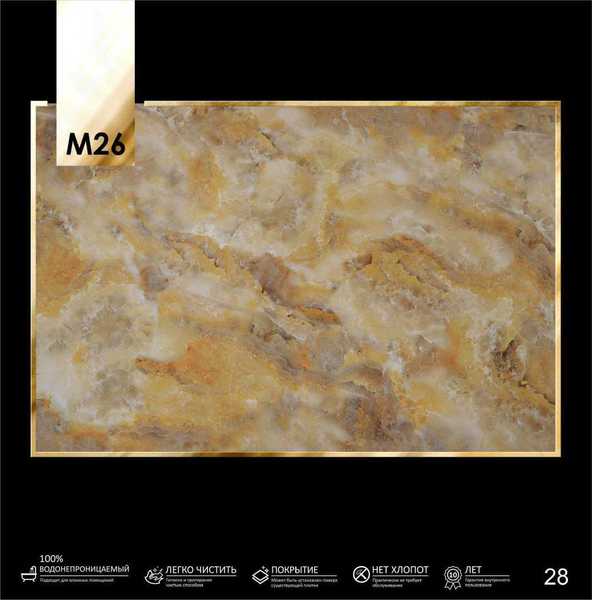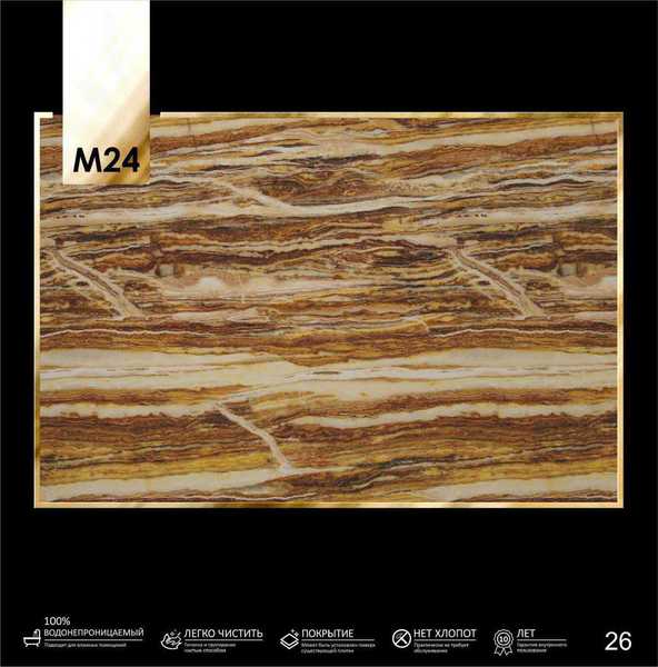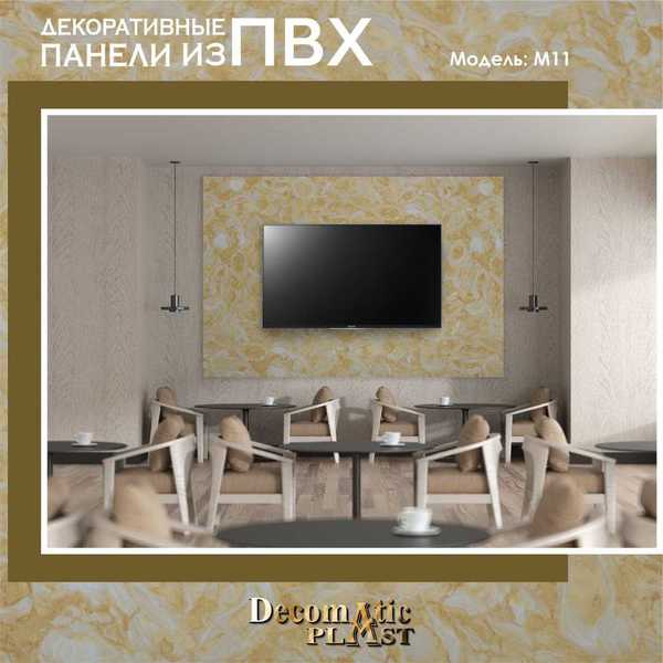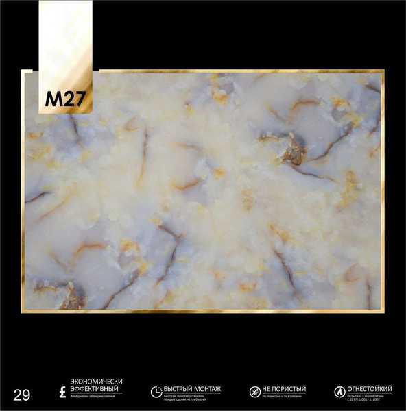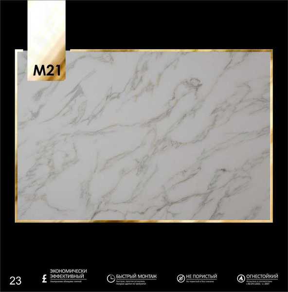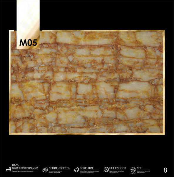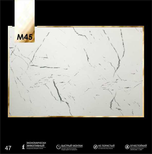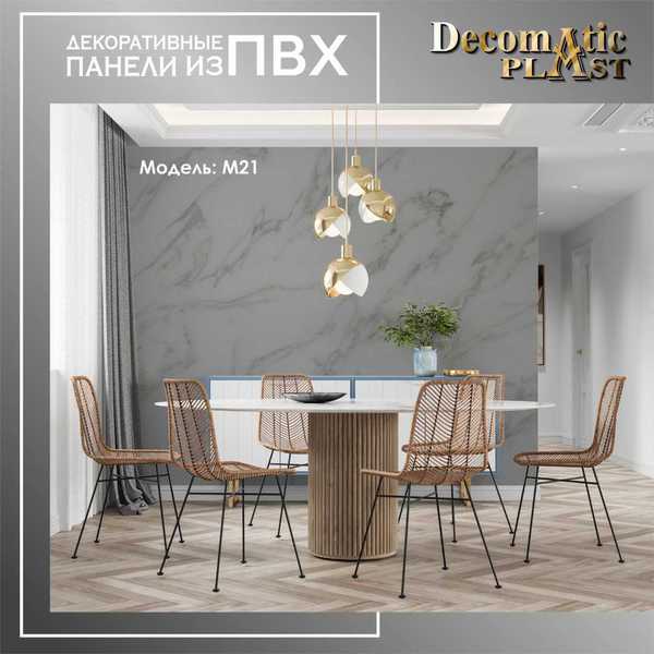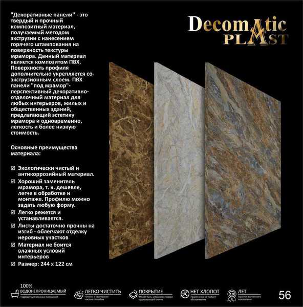 "Dekorative Paneele" - ist ein hartes und haltbares Verbundmaterial, das durch Heißprägen auf der Oberfläche einer Marmorstruktur hergestellt wird. Dieses Material ist ein PVC-Verbundstoff. Die Profiloberfläche wird zusätzlich mit einer Extrusion Schicht verstärkt. Marmorierte PVC-Platten sind ein vielversprechendes dekoratives Veredelungsmaterial für vielfältige Innenräume, Wohngebäude oder öffentliche Gebäude, die Ästhetik von Marmor und gleichzeitig Leichtigkeit und niedrigere Kosten bieten.